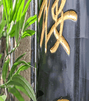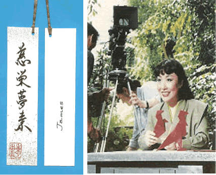 Calligraphy The beauty and simplicity of Japanese calligraphy is a true eye-catcher. Megumi is able to translate a name and using a black brush-tip pen, write it onto a white/gold speckled card bookmarker (usual personalised gift) which is adorned with a short length of golden ribbon (the colour gold representing royalty, strength and wealth) and a red kanji stamp of her name (which means blessing). The meaning of the guests name is written onto the back of the bookmarker. For example, the name James means, nurturing a dream of prosperity.