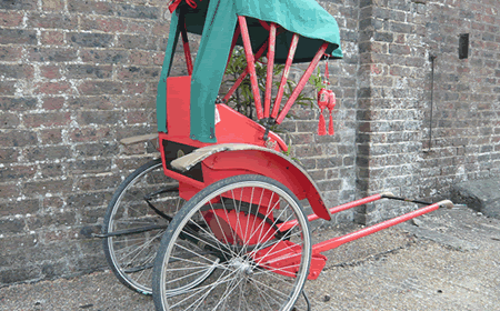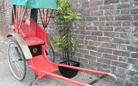 Chinese styled hand pulled Asian/Indian/Japanese antique Rickshaw (full size) for hire, prop for outside (or sometimes inside) your event. Approx 4ft width x 10ft length x 8ft height. In working order, can but not really recommended for transporting guests. Makes a great background item and photo backdrop