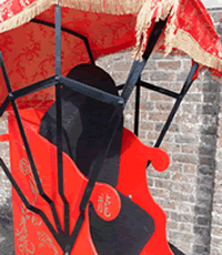Sedan Chair Original Chinese Sedan Chair. This recently acquired exquisite original example is over 130 years old and the patina from the very old paint is utterly amazing. 4m long x 1m wide and 1.7m high. Made of wood with a woven rattan roof, there are original glass panels in the sides and back, the front door opens for entry for the sitter. The black bamboo carry poles are replacements. |