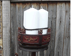 | Large Temple Candle Stands (Pair) Stunning pair of original antique candle stands from a Chinese Temple. They stand 6ft (2M ) tall without the extra 1ft height of the set of 3 candles in each holder (each candle 3" x 9") Very heavily carved on the base (both sides) as well as around the candle sconce. Coloured in traditional red with gold gilding on hardwood. Very solid and stable base supports. Chinese Temple Candle Holders Hire |